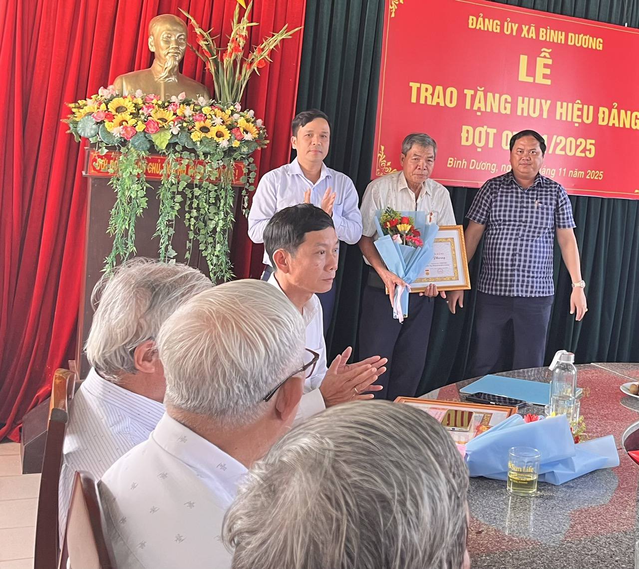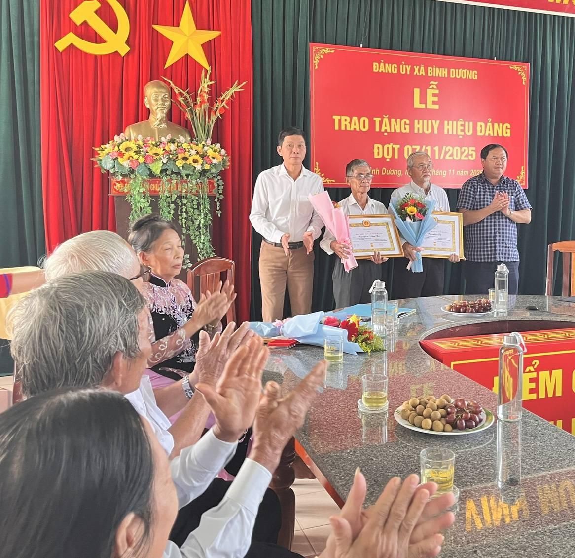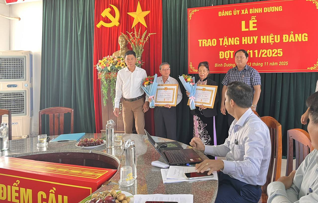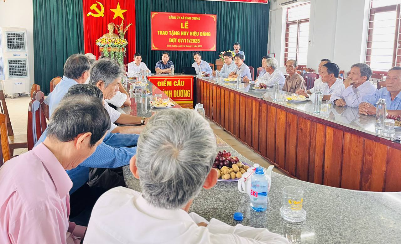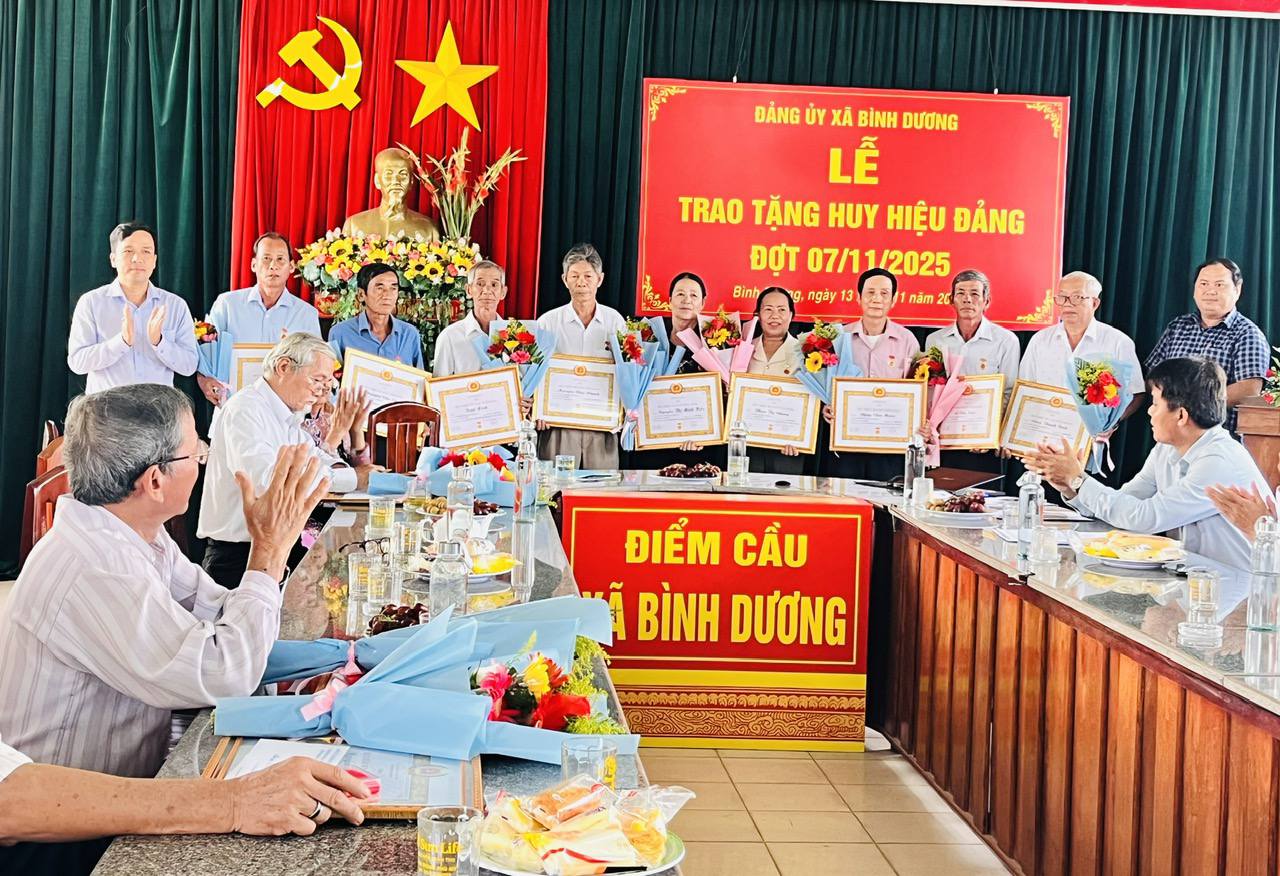 Tại buổi trao Huy hiệu Đảng, lãnh đạo Đảng ủy chúc mừng các đồng chí nhận Huy hiệu Đảng, đồng thời trân trọng ghi nhận những cống hiến của các đảng viên cao tuổi cho lý tưởng của Đảng. Mong muốn các đồng chí đảng viên được nhận Huy hiệu Đảng sẽ tiếp tục nêu cao tinh thần gương mẫu, phát huy bản lĩnh, phẩm chất cách mạng của người đảng viên, tích cực tham gia đóng góp tâm sức, trí tuệ xây dựng xã Bình Dương ngày càng phát triển.